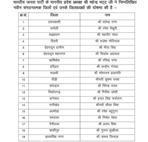 बुलंद आवाज़ न्यूज़ भारतीय जनता पार्टी के प्रदेश अध्यक्ष महेंद्र भट्ट ने नवीन संगठनात्मक...
