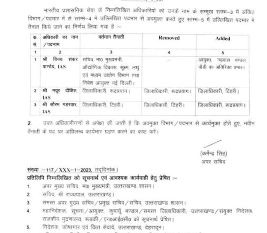 उत्तराखण्ड तबादला: मयूर दीक्षित बने जिलाधिकारी टिहरी, सौरभ गहरवार ने थामी रुद्रप्रयाग की कमान July 1, 2023 bulandawaaj बुलंद आवाज़ न्यूज चमोली विनय शंकर पांडे को आयुक्त गढ़वाल मंडल का प्रभार दिया...