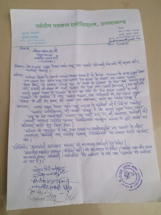 गोपेश्वर। अधिकारी, कर्मचारियों के बाद अब देवाल ब्लाक प्रमुख पर पत्रकारों को धमकाने पर पिंडर घाटी के पत्रकारों ने आक्रोश व्यक्त किया है। इस संबंध में मुख्यमंत्री, भाजपा प्रदेश अध्यक्ष, कैबिनेट मंत्री, थराली विधायक सहित जिलाधिकारी, पुलिस अधीक्षक चमोली, उप जिलाधिकारी एवं थाना निरीक्षक थराली को पत्र भेजे हैं। इसके अलावा इस संबंध में पत्रकारों के प्रदेश स्तरीय संगठनों को भी पत्र भेजे गए हैं।