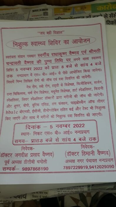 चमोली : हर साल की भांति इस साल भी स्वर्गीय राधाकृष्ण वैष्णव एवं उनकी धर्मपत्नी स्वर्गीय चन्द्रवती वैष्णव की पुण्य स्मृति में पांच नवंबर को नंदप्रयाग मेन बाहर भारतीय स्टेट बैंक शाखा के पीछे और गढ़वाल मंडल विकास निगम के परिसर में निशुल्क स्वास्थ्य शिविर आयोजित होगा।
