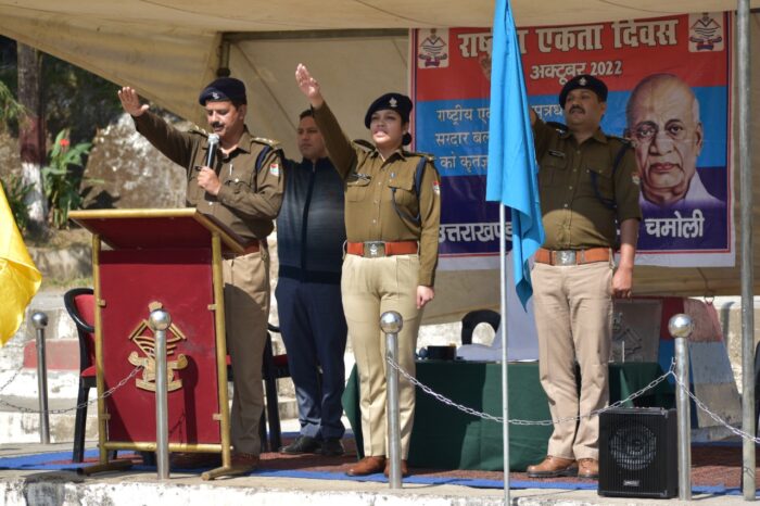 पुलिस उपाधीक्षक चमोली प्रमोद कुमार शाह महोदय द्वारा पुलिस लाइन में उपस्थित अधीनस्थ पुलिस अधिकारी/कर्मचारी गणों, एनसीसी कैडेटों को संबोधित करते हुए बताया गया, कि भारत के लौह पुरुष कहे जाने वाले सरदार वल्लभ भाई पटेल के जन्म दिवस के उपलक्ष्य में राष्ट्रीय एकता दिवस मनाया जाता है। चूंकि सरदार वल्लभ भाई पटेल द्वारा देश को हमेशा एकजुट करने के लिए अनेकों प्रयास किये गए, इन्ही कार्य को याद करते हुए इस दिन को राष्ट्रीय एकता दिवस के रूप में मनाने का फैसला किया गया है। इसीलिए पुलिस बल का यह विशेष कर्तव्य होना चाहिए कि हम पुलिस के अनुशासित बल में नियुक्त रहते हुए राष्ट्र की एकता, अखंडता को अक्षुण्य रखने में अपना महत्वपूर्ण योगदान बनाए रखें।
