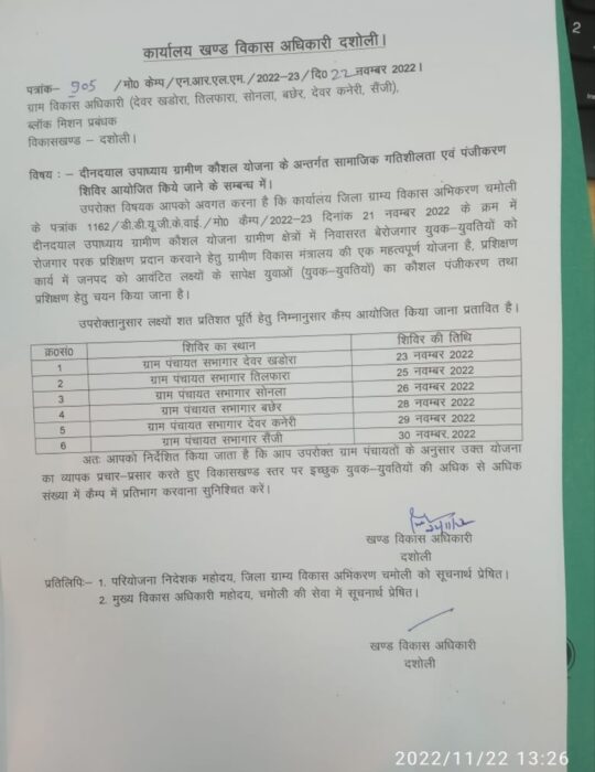 जिला ग्राम्य विकास अभिकरण चमोली के पत्रांक से प्राप्त सूचना के अनुसार दीन दयाल उपाध्याय ग्रामीण कौशल योजना के अंतर्गत ग्रामीण क्षेत्रों में निवासरत बेरोजगार युवक युवतियों को रोजगार परक प्रशिक्षण प्रदान करवाने हेतु ग्रामीण विकास मंत्रालय ने एक पहल की है जिसमें कि युवक युवतियों को उनके कौशल के अनुरूप प्रशिक्षण हेतु चयन किया जाना है।