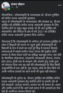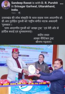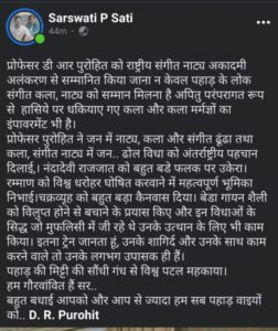 पहाड के लोकसंस्कृति के ध्वजावाहक और संरक्षक डा. डीआर पुरोहित को प्रतिष्ठित संगीत नाटक अकादमी पुरस्कार के लिए चयनित होने पर सोशल मीडिया में बधाइयां मिलनी शुरू हो गई हैं । आपको बता दे कि प्रो डी आर पुरोहित को लोकसंगीत और थियेटर के क्षेत्र में वर्ष 2021 का प्रतिष्ठित संगीत नाटक अकादमी पुरस्कार दिया जाना है। जिसको लेकर सोशल मीडिया में उनके चर्चों की शुरुआत भी हो गई है।