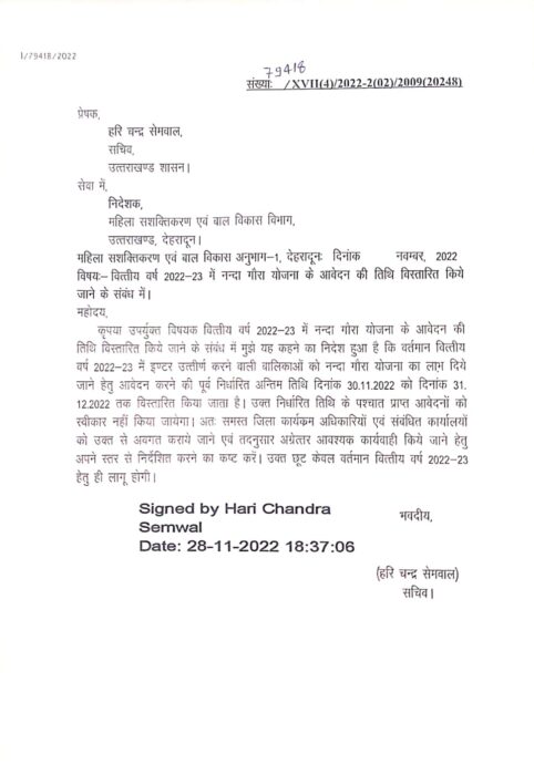 महिला सशक्तिकरण एवं बाल विकास अनुभाग के पत्र से मिली जानकारी के अनुसार वर्ष 2022 में बारहवीं उत्तीर्ण करने वाली छात्राओं के लिए नंदा गौरा योजना के आवेदन की तिथि को 31 नवंबर तक विस्तारित कर लिया है।