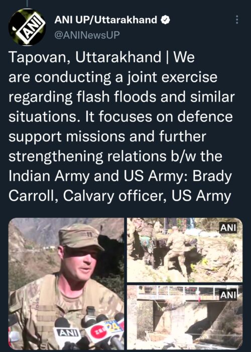 Tapovan, Uttarakhand | We are conducting a joint exercise regarding flash floods and similar situations. It focuses on defence support missions and further strengthening relations b/w the Indian Army and US Army: Brady Carroll, Calvary officer, US Army pic.twitter.com/WgXwxNnlt2