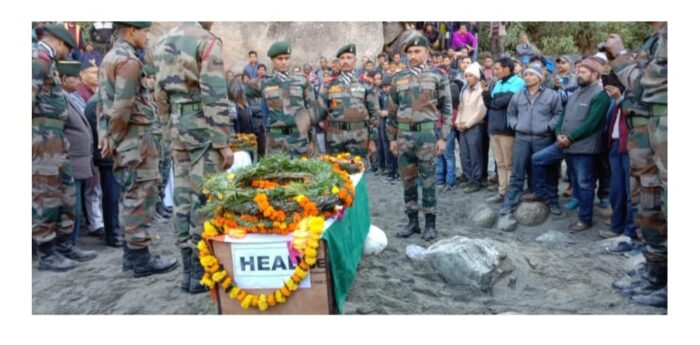 समस्त गांव वासियों ने मिलकर के पार्थिव शरीर को गाड़ी से बाहर निकाल कर आर्मी द्वारा अंतिम दर्शन के लिए उनके घर ले गए जहां उनकी माता पुष्पा देवी अपने पुत्र के शव को देख कर बेहोश हो गई जिन्हें किसी तरह परिजनों द्वारा होश में लाया गया और इस अवसर पर सभी की आंखें नम हो गई तत्पश्चात उनके पार्थिव शरीर को पैतृक खाट मींग गधेरा लाया गया जहां पर 20 गढ़वाल ग्रेनेडियर रुद्रप्रयाग से मेजर सुरेश की अगुवाई में गढ़वाल स्काउट्स जोशीमठ के 15 जवानों द्वारा सैनिक सम्मान के साथ प्रीत चढ़ाकर अंतिम सलामी के साथ विदाई दी गई।