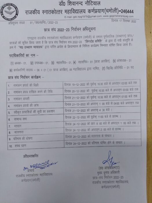 डॉ शिवानंद नौटियाल राजकीय स्नातकोत्तर महाविद्यालय कर्णप्रयाग मे छात्र संघ चुनाव 2022-23 की अधिसूचना जारी कर दी गयी है इससे पूर्व सम्भावित प्रत्याशी के साथ छात्र नेताओ के साथ बैठक आयोजित की गयी। जिसमे निर्वाचन अधिकारी डॉ आर सी भट्ट ने प्रभारी प्राचार्य डॉ एम एस कण्डारी ने चुनाव सम्बन्धित जानकारी छात्र एवं छात्राओ की दी।