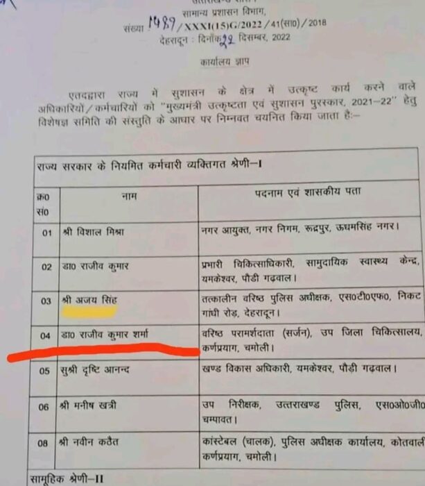 प्रयाग उप जिला अस्पताल के वरिष्ठ परामर्शदाता डॉ राजीव कुमार शर्मा (सीएमओ चमोली), कर्णप्रयाग के एसपी कार्यालय के कॉन्स्टेबल (चालक) नवीन कठैत, रुद्रपुर के नगर आयुक्त विशाल मिश्रा, सीएचसी यम्केश्वर के प्रभारी चिकित्सा अधिकारी डॉ राजीव, एसटीएस के तत्कालीन एसएसपी अजय सिंह ,यम्केश्वर की वीडीओ दृष्टि आनंद, एसओजी चंपावत के उप निरीक्षक मनीष खत्री.