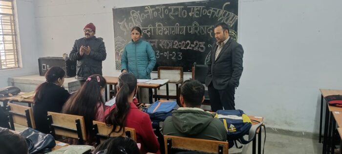 विभागीय परिषद के गठन के पश्चात हिंदी विभागाध्यक्ष डॉ राधा रावत द्वारा छात्र छात्राओं को विभागीय परिषद के कार्य व विभागीय परिषद द्वारा आयोजित प्रतियोगिताओं व कार्यक्रमों की जानकारी दी गई । हिंदी विभागीय परिषद के गठन में मीनाक्षी एम० ए० तृतीय सेमेस्टर को अध्यक्ष कामिनी, एम० ए० प्रथम सेमेस्टर को उपाध्यक्ष, प्रियंका बी०ए० तृतीय वर्ष को सचिव, स्वाति बी०ए० द्वितीय वर्ष को संयुक्त सचिव व प्रियंका बी०ए० प्रथम वर्ष को सह सचिव नियुक्त किया गया।