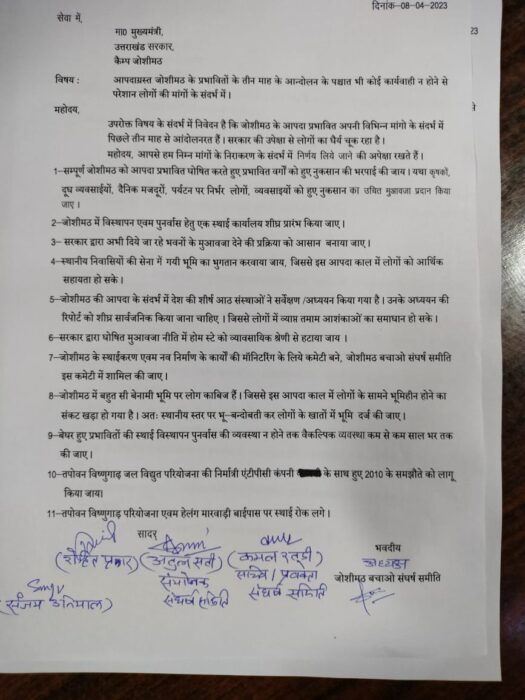 जोशीमठ बचाओ संघर्ष समीति के नेतृत्व में, जोशीमठ आपदा के प्रभावितों के विभिन्न सवालों, जोशीमठ नगर के पुनर्स्थापन स्थायीकरण नवनिर्माण एवं सम्पूर्ण जोशीमठ के प्रत्यक्ष परोक्ष प्रभावितों को हुए नुकसान की भरपाई/मुआवजे की मांगो को लेकर पिछले एक सौ सात (107) दिनों से चल रहे धरने को आज दिनांक 21 अप्रैल 2023 से 20दिनों के लिये स्थगित किया गया है ।