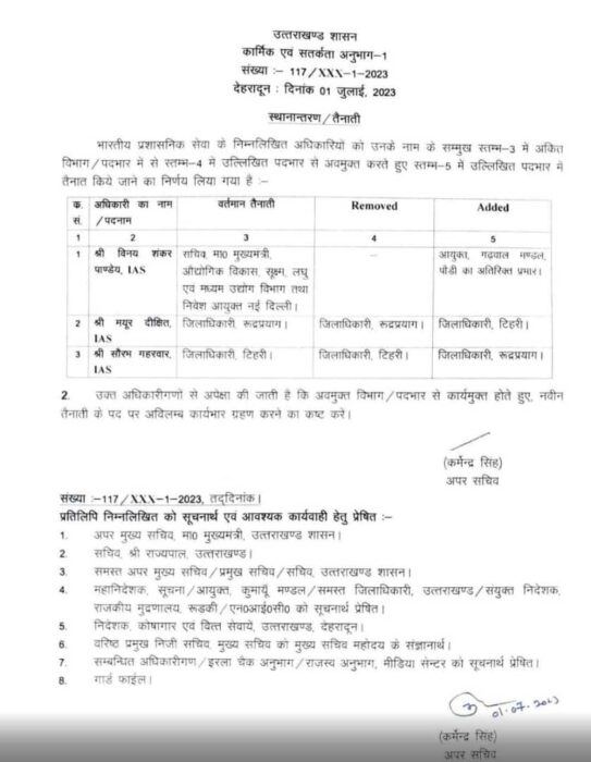 उत्तराखण्ड तबादला: मयूर दीक्षित बने जिलाधिकारी टिहरी, सौरभ गहरवार ने थामी रुद्रप्रयाग की कमान bulandawaaj July 1, 2023 Shareबुलंद आवाज़ न्यूजचमोलीविनय शंकर पांडे को आयुक्त गढ़वाल मंडल का प्रभार दिया गया.मयूर दीक्षित को रुद्रप्रयाग से हटा कर जिलाधिकारी टिहरी बनाया गया.सौरभ गहरवार को टिहरी जिलाधिकारी से हटा कर रुद्रप्रयाग की जिम्मेदारी दी गयी.ShareContinue ReadingPrevious Uttarakhand Weather: देहरादून समेत टिहरी और पौड़ी में भारी बारिश की चेतावनीNext देवाल में खाई में जा गिरी पिकप, 1 व्यक्ति घायलLeave a Reply Cancel replyYour email address will not be published. Required fields are marked *Comment *Name * Email * Website Save my name, email, and website in this browser for the next time I comment. More Stories उत्तराखण्ड राजनीति राज्य राज्य में बनेगी 23 नई खेल अकादमियाँ, हर साल 920 इंटरनेशनल एथलीट तैयार होंगे: मुख्यमंत्री November 30, 2025 bulandawaaj उत्तराखण्ड राजनीति राज्य विशेष उत्तराखंड बना निवेश और नवाचार का नया केंद्र: सीएम धामी November 27, 2025 bulandawaaj उत्तराखण्ड राज्य उत्तराखंड: बस दुर्घटनाग्रस्त, पांच की मौत; 17 घायल November 24, 2025 bulandawaaj