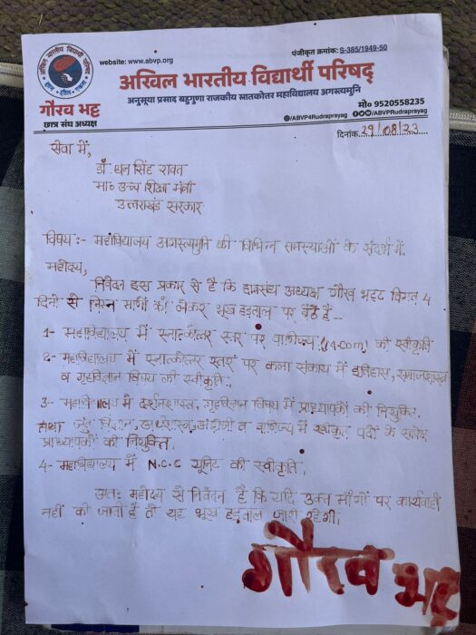रुद्रप्रयाग जिले के अगस्त्यमुनि महाविद्यालय में महाविद्यालय की समस्याओं को लेकर अखिल भारतीय विद्यार्थी परिषद के कार्यकर्ता 4 दिनों से आंदोलनरत हैं. और आज 4 दिन बीत जाने के बाद महाविद्यालय के छात्र संघ अध्यक्ष गौरव भट्ट ने उच्च शिक्षा मंत्री डॉ धन सिंह रावत को खून से पत्र लिखकर महाविद्यालय की समस्याओं से रूबरू करवाया. गौरव ने बताया कि हम महाविद्यालय में व्याप्त समस्याओं के निवारण के लिए विगत 4 दिनों से भूख हड़ताल में बैठे हैं हमारी 4 मांगे हैं
