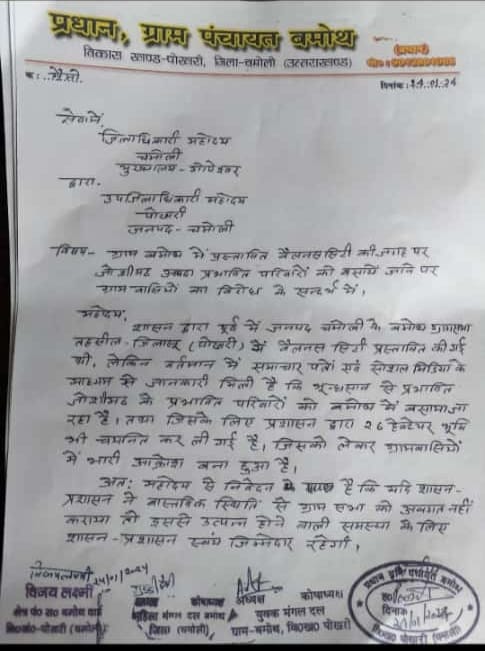 बुधवार को उप जिलाधिकारी पोखरी कमलेश मेहता को प्रस्तुत किए गए ज्ञापन में जनप्रतिनिधियों ने कहा है कि पूर्व में जनपद चमोली की ग्राम सभा बमोथ को वैलनेस सिटी के लिऐ शासन द्वारा प्रस्तावित किया गया था। लेकिन वर्तमान में समाचार पत्रों एवं सोशल मीडिया के माध्यम से जानकारी मिली है कि भू धंसाव से प्रभावित जोशीमठ के प्रभावितों के लिए प्रशासन द्वारा बमोथ गांव में 26 हेक्टेयर भूमि चयनित की गई है। जिसको लेकर गांववासियों में भारी आक्रोश बना हुआ है।