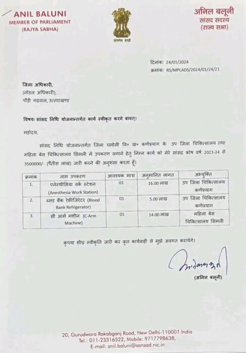 चमोली: चमोली जिले के कर्णप्रयाग और महिला बेस अस्पताल सिमली में 35 लाख के अत्याधुनिक उपकरण राज्यसभा सदस्य एवं भारतीय जनता पार्टी के राष्ट्रीय मीडिया प्रमुख अनिल बलूनी ने सांसद निधि से प्रदान किए हैं। जिसकी जानकारी बलूनी ने प्रेस नोट रिलीज करते हुए दी. जिसमें से 16 लाख की लागत का एनेस्थीसिया वर्क स्टेशन और 5 ब्लड बैंक रेफ्रीजरेटर उप जिला चिकित्सालय कर्णप्रयाग और 14 लाख का सी आर्म मशीन महिला बेस अस्पताल सिमली को मिला है. जिससे क्षेत्र में लोगों में एक बार फिर खुशी की लहर दिखाई दे रही है और सोशल मीडिया के माध्यम से सभी बधाइयां और शुक्रिया अदा कर रहे हैं.