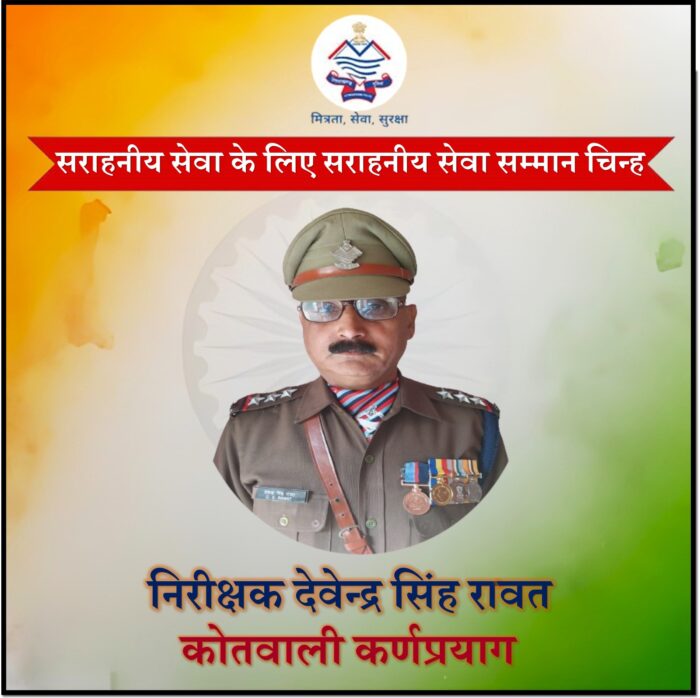 75वें गणतंत्र दिवस के अवसर पर पुलिस महानिदेशक, उत्तराखण्ड महोदय द्वारा चमोली पुलिस के प्रभारी निरीक्षक कोतवाली कर्णप्रयाग देवेंद्र रावत को सराहनीय सेवा के लिए (सेवा आधार पर) सराहनीय सेवा सम्मान चिन्ह प्रदान किया गया।