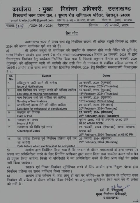 उत्तराखंड में राज्यसभा सांसद अनिल बलूनी का कार्यकाल खत्म होने जा रहा है ऐसे में रिक्त हुई एक राज्यसभा सीट के चलते मतदान 27 फरवरी को मतदान किया जाएगा और मुख्य निर्वाचन अधिकारी कार्यालय 8 फरवरी को इसकी अधिसूचना जारी करेगा.