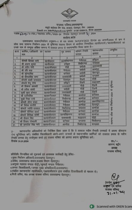 चमोली: 3 जनवरी 2024 के क्रम में लोकसभा सामान्य निर्वाचन 2024 के दृष्टिगत राजस्व विभाग के अंतर्गत तहसीलदारों और प्रभारी तहसीलदारों का ट्रांसफर हुआ था जिसमें से चमोली में तैनात 4 प्र तहसीलदार प्रदीप नेगी, रवि शाह, सुरेंद्र देव, धीरज राणा का ट्रांसफर अल्मोड़ा, देहरादून, चम्पावत और उत्तरकाशी हुआ.