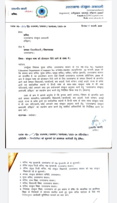 पत्र में कहा गया है कि संस्कृत में नाम लिखने में उत्तराखंड संस्कृति अकादमी हरिद्वार से सहयोग प्राप्त किया जा सकता हैं।इन निर्देशों के बाद जल्द ही पूरे राज्य की शिक्षण संस्थाओं, विभागों में संस्कृत में लिखे बोर्डों,नाम पटिकाओं के चमचमाने की संभावना है जिससे संस्कृति प्रेमियों में खासा उत्साह देखने को मिल रहा हैं।