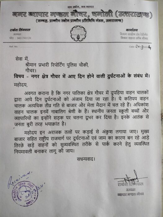 व्यापार संघ अध्यक्ष राकेश लिंगवाल ने बताया कि नगर पालिका परिषद गौचर में दुपहिया वाहन चालकों द्वारा आये दिन दुर्घटनाओं को अंजाम दिया जा रहा है. जिसका कारण तीव्र गति में चलना है. उन्होंने बताया कि उनमें ज्यादातर वाहन चालक नाबालिग की श्रेणी में हैं जिसके कारण क्षेत्र में दुर्घटनाएं हो रही है. जिसे देखते हुए उन्होंने ज्ञापन सौंपा.