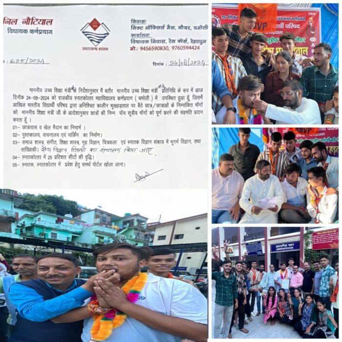अभाविप कर्णप्रयाग इकाई के कार्यकर्ताओं द्वारा 12 अगस्त से महाविद्यालय में 5 सूत्रीय मांगों को लेकर अनिश्चितकालीन धरना प्रदर्शन किया, जो कि 10 दिन तक चला। मांग पूरी न होने के कारण अभाविप के कार्यकर्ता अंशुल रावत ने 3 दिन तक भूख हड़ताल भी शुरू थी। जो मांगें पूरी होने के दावे के साथ खत्म हो गई है।