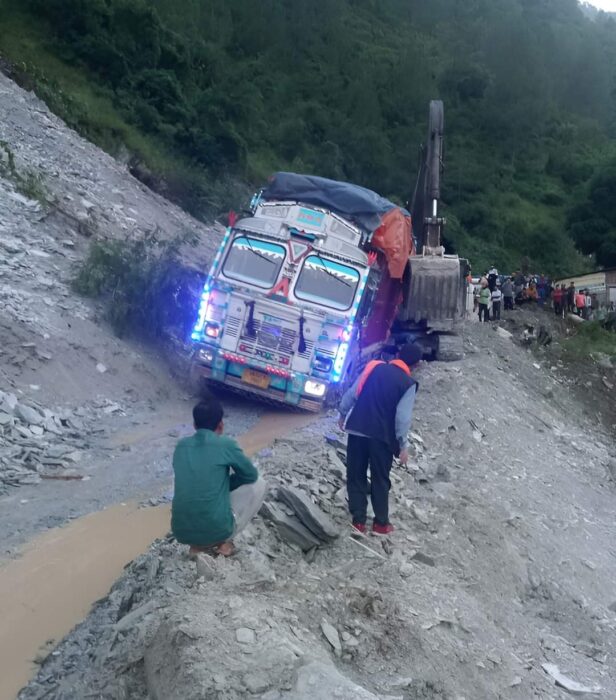 गौचर। बदरीनाथ हाइवे पर गौचर से करीब चार किमी कर्णप्रयाग की ओर (चटवापीपल) भूस्खलन जोन में सुबह एक लोड ट्रक फंस गया। जिसके कारण हाइवे पर यातायात बंद हो गया।
