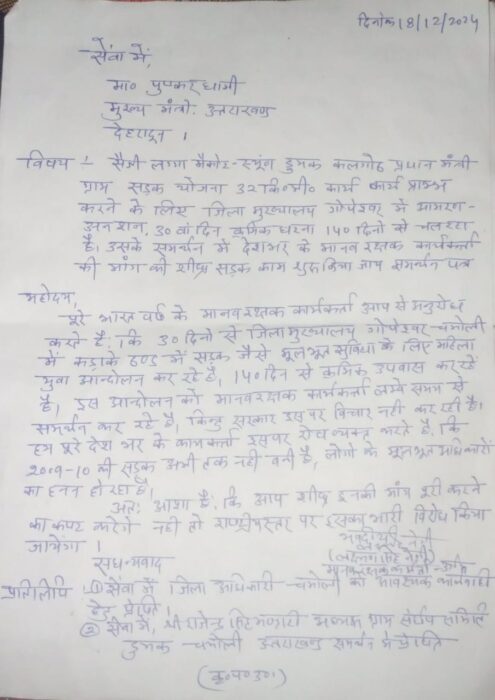 मानव अधिकार रक्षक कार्यकर्ता लक्ष्मण सिंह नेगी ने बताया कि इस पत्र में देश भर के विभिन्न प्रांतों के 80 से अधिक लोगों के हस्ताक्षर कर आंदोलन का समर्थन किया जिसमें उत्तराखंड, राजस्थान, दिल्ली, झारखंड, मध्य प्रदेश, गुजरात, बिहार, छत्तीस गढ़, मणिपुर, जम्मू कश्मीर, सहित कई राज्यों के लोग शामिल हैं।
