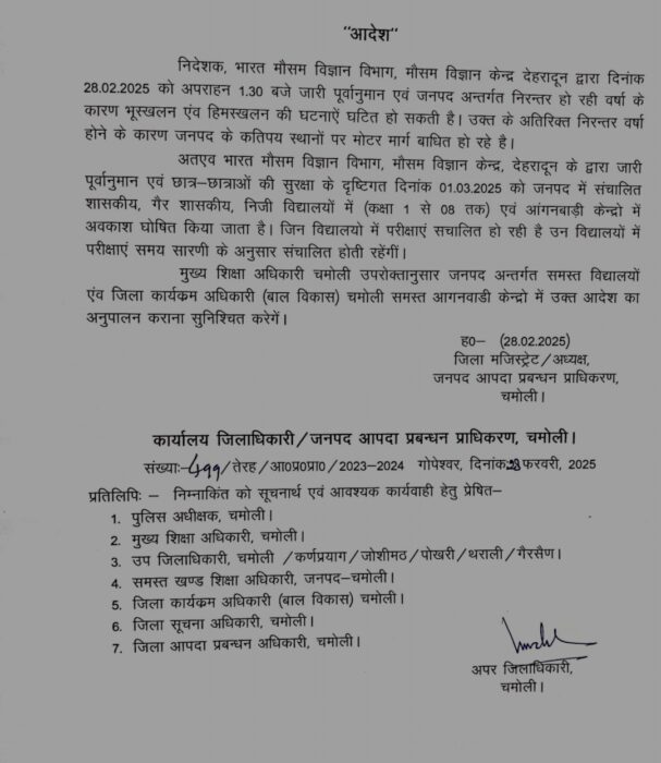 मौसम विज्ञान केंद्र के पूर्वानुमान के अनुसार कल दिनांक 1 मार्च को भारी बारिश और बर्फबारी की चेतावनी दी गई है इसके बाद चमोली जिला प्रशासन ने जनपद के सभी विद्यालयों में कक्षा एक से कक्षा 8 तक व आंगनबाड़ी केंद्रों में अवकाश की घोषणा की है।