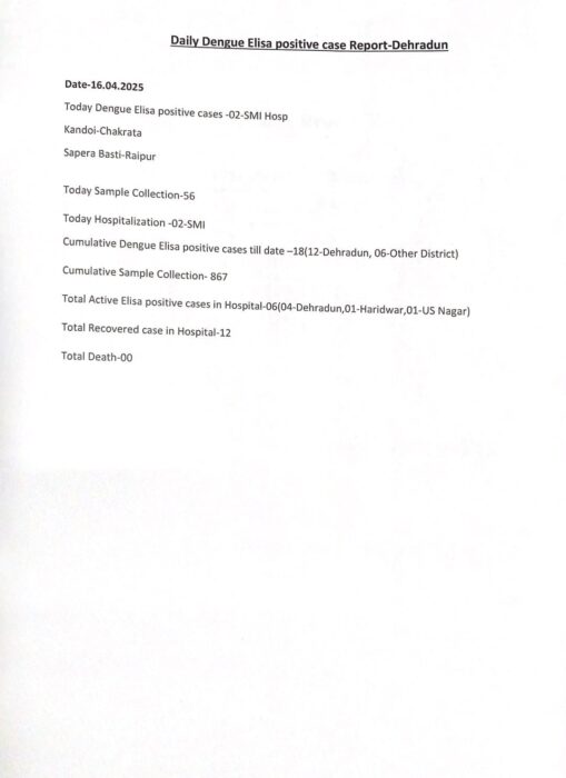 जनपद में डेंगू के संभावित खतरे को दृष्टिगत रखते हुए मुख्य चिकित्सा अधिकारी देहरादून डॉक्टर मनोज कुमार शर्मा ने बुधवार को जनपद की समस्त विद्यालयों चिकित्सालय, रक्त कोषों एवं लैबों को आवश्यक दिशा निर्देश जारी किए। इससे पहले मंगलवार को डॉ शर्मा ने जनपद के समस्त चिकित्सा अधिकारियों की बैठक लेते हुए मौखिक निर्देश दिए थे। जिनका विवरण निम्नलिखित है –