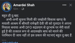 प्रदेश उपाध्यक्ष अनु० मोर्चा भाजपा और जिला पंचायत रुद्रप्रयाग की अध्यक्ष अमरदेई शाह ने सोशल मीडिया पोस्ट के जरिए बताया कि मयाली के नजदीकी गांव की महिला रामेश्वरी देवी को गुलदार ने अपना निवाला बनाया. उन्होंने बताया कि उन्होंने डीएफओ रुद्रप्रयाग से दूरभाष पर बातचीत करते हुए कहा कि तत्काल आदमखोर बाघ को मारने की परमिशन दी जाय नहीं तो इस प्रकार की घटनाएं होती रहेंगी जो बहुत दुःखद हैं. वहीं दूसरी ओर सोशल मीडिया पर लोगों ने शासन प्रशासन पर नकारात्मक प्रतिक्रियाओं की बौछार कर दी है.  Nausari Samitee Lassya के यूजर ने लिखा कि